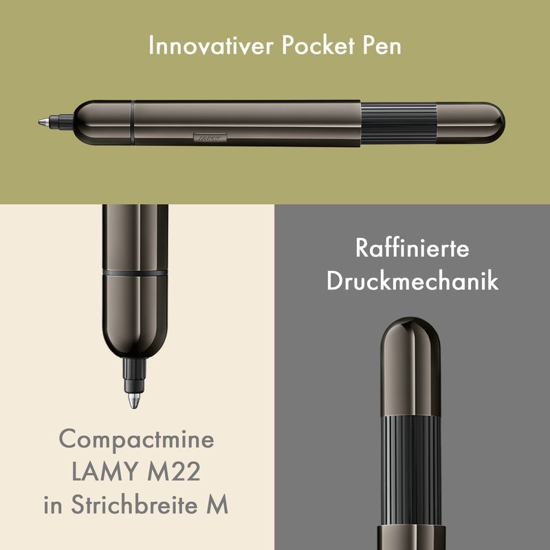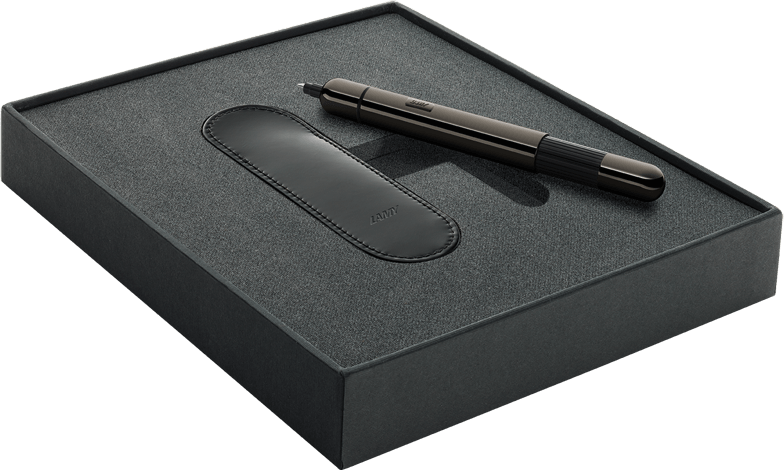 Set compuesto por LAMY pico Lx ruthenium, una bolígrafo especialmente diseñada para el pocket con recambio compacto LAMY M22 M negro y un estuche de piel auténtica en una caja de regalo.